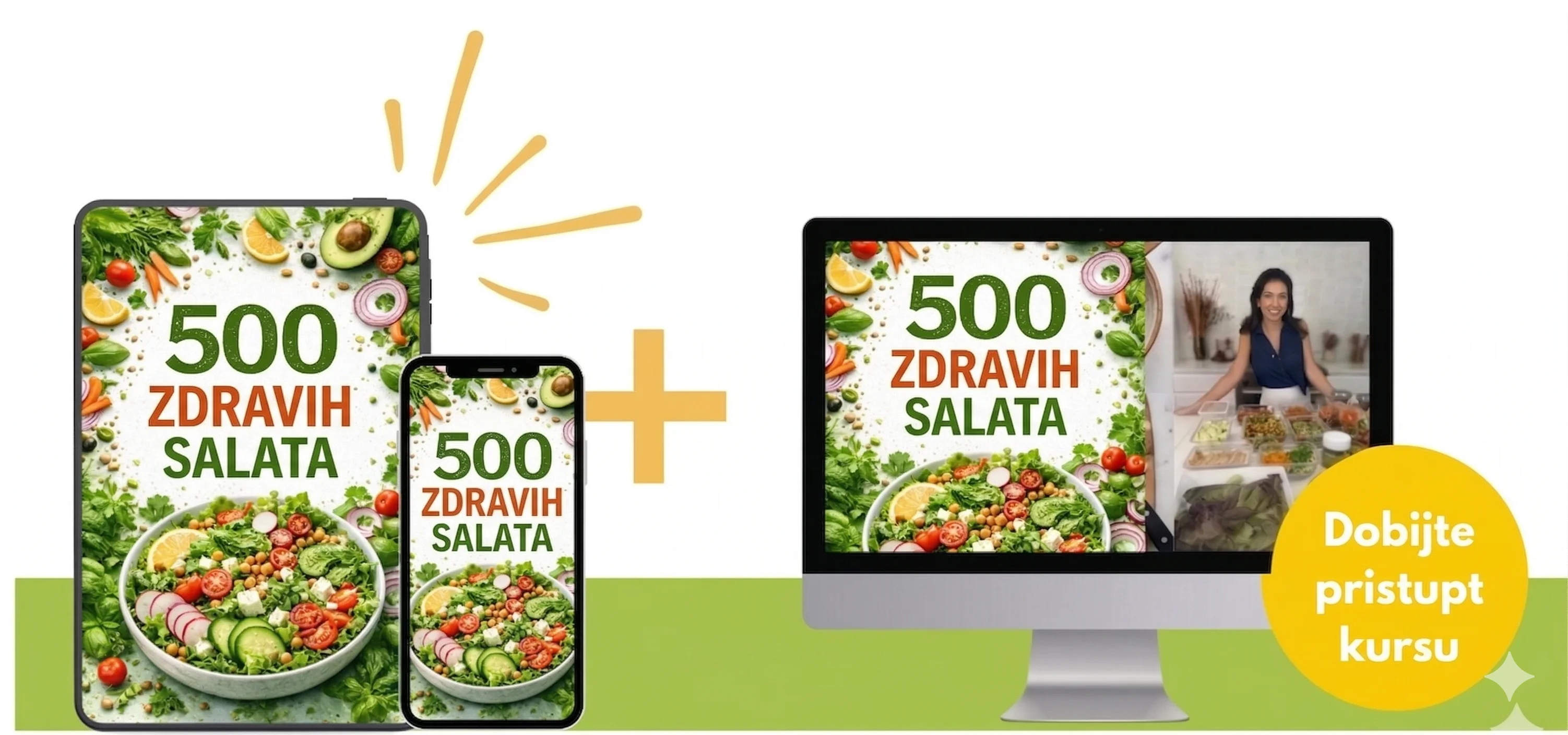 U ovoj ponudi dobijaš potpuno besplatno i pristup jelovnicima 'Ukusne salate 2.0', koji uključuju kompletan plan ishrane, spiskove za kupovinu i jasne korake za pripremu.